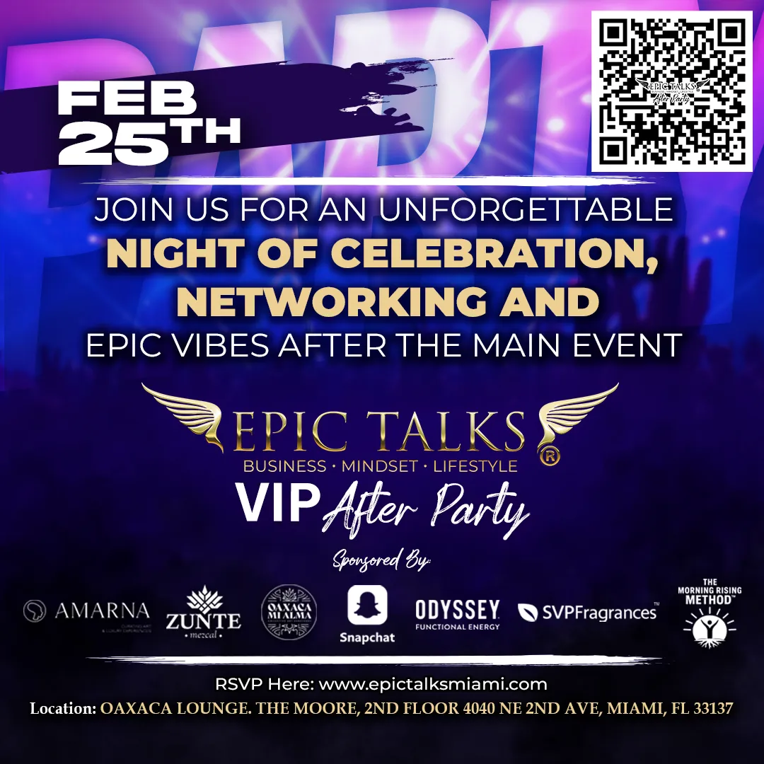 Epic Talks is an internationally recognized premiere networking event with attendees flying in from all around the nation to attend. True Mavericks in their fields and successful 7, 8 and 9-figure professionals and business owners divulge their secrets to success. With a red carpet, performances from Miami’s top entertainers, featured artists, media, cocktails, wine and a vast array of delectables, Epic Talks is a one-of-a-kind event that you don’t want to miss. Particularly this one which is set to be one of our most popular event yet!